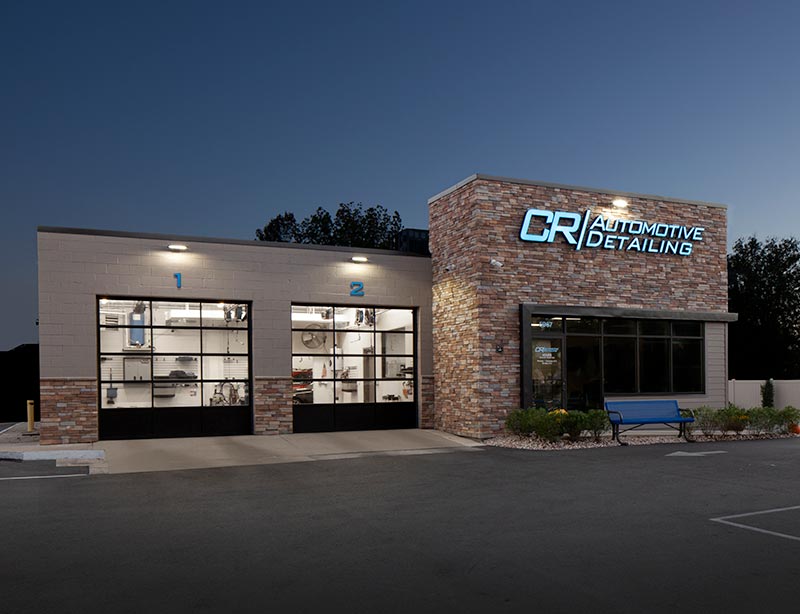exterior of CR Automotive at dusk with lights on inside the two garage bays with glass doors