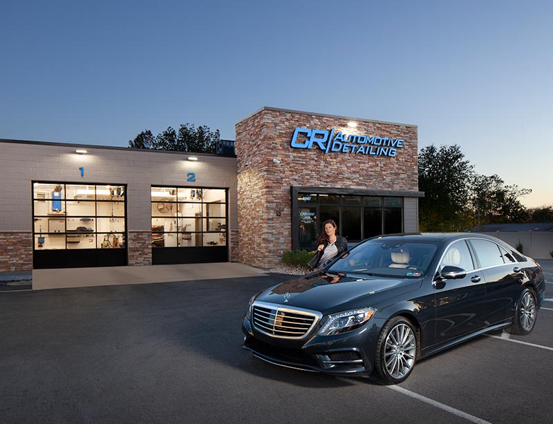 exterior of CR Automotive with black Mercedes sedan out front, woman getting into passenger side