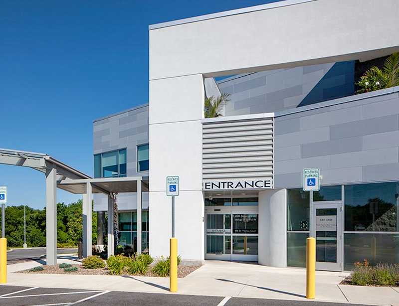 Sir Thomas Court exterior focused on entrance overhang Harrisburg, PA
